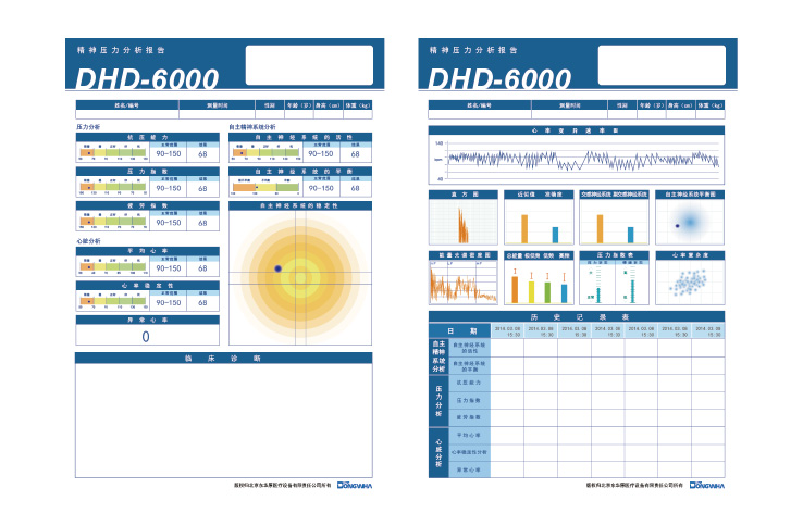 - 心率变异性检测仪DHD-6000通过对心率变异(HRV)的分析,测量自主神经系统的交感和副交感神经功能,准确分析由于压力引起的自主神经系统失去平衡所导致多种功能紊乱,用于评估心理健康状况,可作为普通人群精神心理类疾病及心理类疾病所引起的相关疾病的早期预警指标,达到早期发现,早期治愈的目的。