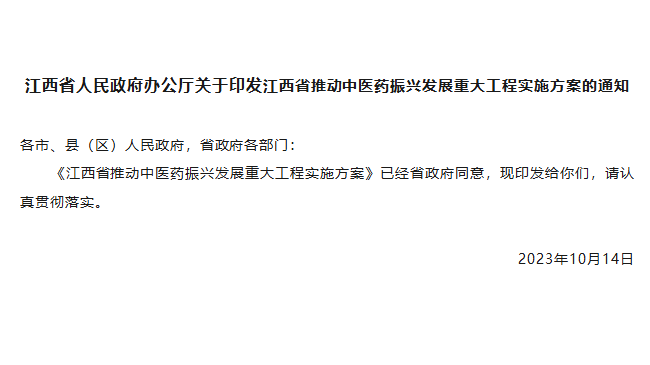 江西省人民政府办公厅关于印发江西省推动中医药振兴发展重大工程实施方案的通知