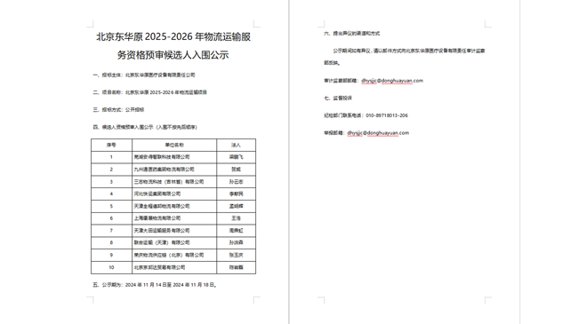 东华原医疗2025-2026年物流运输服务资格预审候选人入围公示