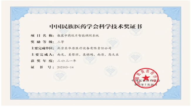 - 近日,中国民族医药学会发布《关于2021年度中国民族医药学会科学技术奖的奖励决定》(中民医药会科〔2022〕50号)文件,公布了2021年中国民族医药学会科学技术奖评选结果,东华原“散装中药饮片智能调剂系统”项目荣获三等奖。中国民族医药学会科学技术奖是由中国民族医药学会设立,用以推动各民族医药学术传承发展,总结各民族医药学术成就与最新研究进展,奖励各民族医药学术领域取得的优秀成果的奖项。奖项的评选是根据《中国