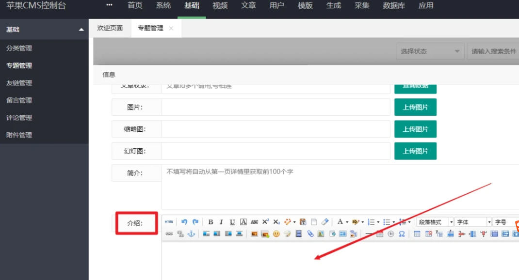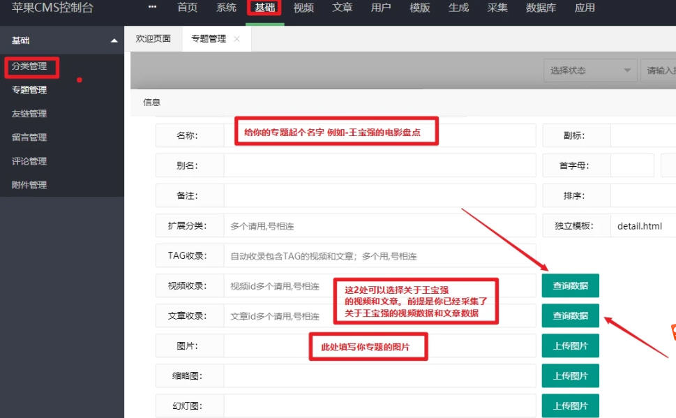 只要用苹果cms后台的影视系统-都适用。1,进入苹果cms后台按顺序点击 基础>>>专题管理>>>添加