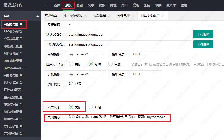 网站难免有时候需要暂停维护下,苹果CMS后台自带这种非常友好的网站临时关闭的提示功能。 我们只需要登录后台-系统-网站参数配置-基本设置-站点状态