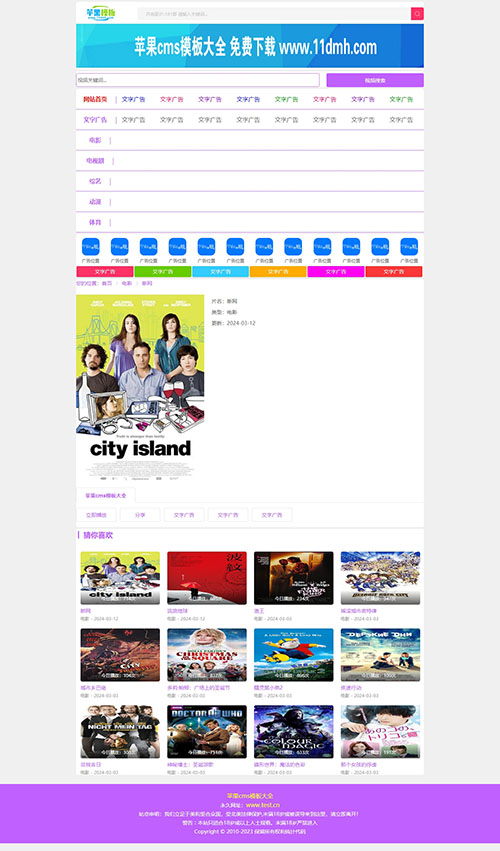 高贵紫色设计,代码兼容pc、wap自适应访问,特别适合于影视网站及影视站群,其模板文件简单,广告位都已经设置好了,并已修复原模板详情页及播放页剧集无法显示bug;可